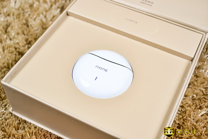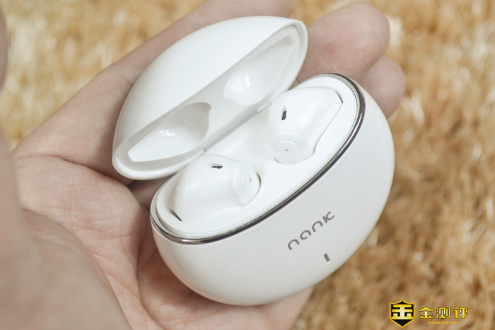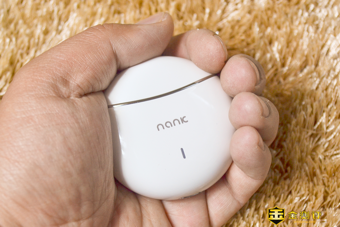 圆形的充电盒握在手心,圆润的像一块玉石一样。浅灰色的南卡LOGO居中而立,下方是一个充电盒的工作指示灯位置。红绿蓝三色代表不同的工作状态。
