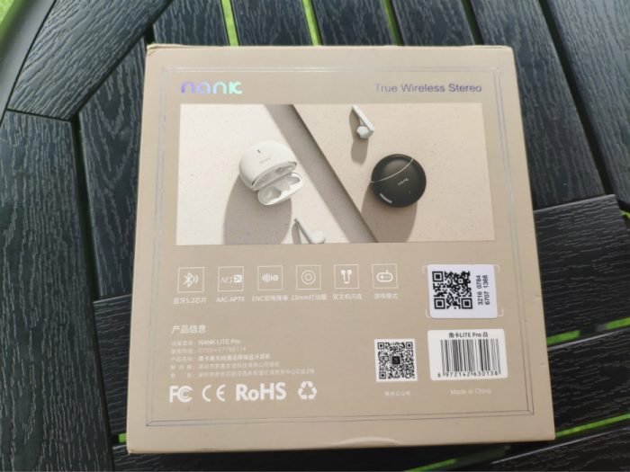 背面写明了这款耳机的主要特点:蓝牙5.2芯片、AAC-APTX解码技术、ENC双麦降噪,13mm大动圈单元,双主机闪连以及游戏模式。