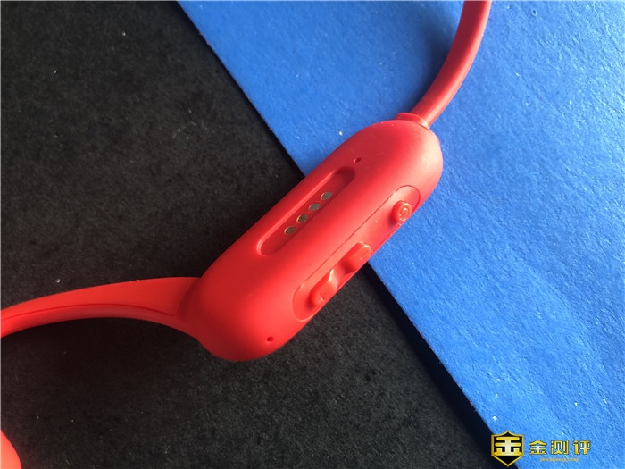 右边耳机后部内侧面是这款产品的充电和数据传输触点接口,因为防水设计直接采用4个外露的触点接口设计,用专用的数据线连接电脑,可以给蓝牙耳机充电和存入音乐文件,边上有一颗状态指示灯,来电 蓝牙断开都有相应的红蓝闪烁提示。
