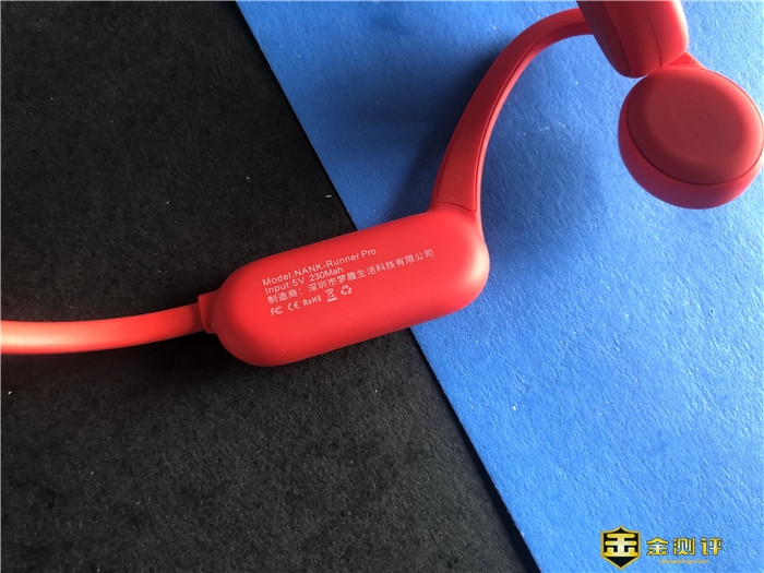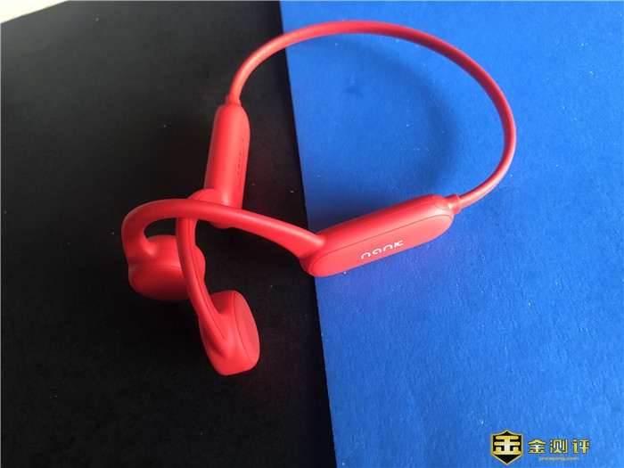 我拿到的这款为红色款,同时这款产品还设置了黑色版本可供选择,NANK南卡骨传导Runner Pro骨传导运动蓝牙耳机基于人体工程学设计,采用挂耳外放设计。左边耳机发声部件后部有这款耳机产品的品牌标示' NANK',后部应该是内置电池仓,包括后部的骨架都采用全硅胶包裹全封闭式设计,使用中也无需担心运动出汗导致的液体侵蚀,非常nice。手感极好,这也是佩戴舒适的保证,整体设计非常低调时尚。