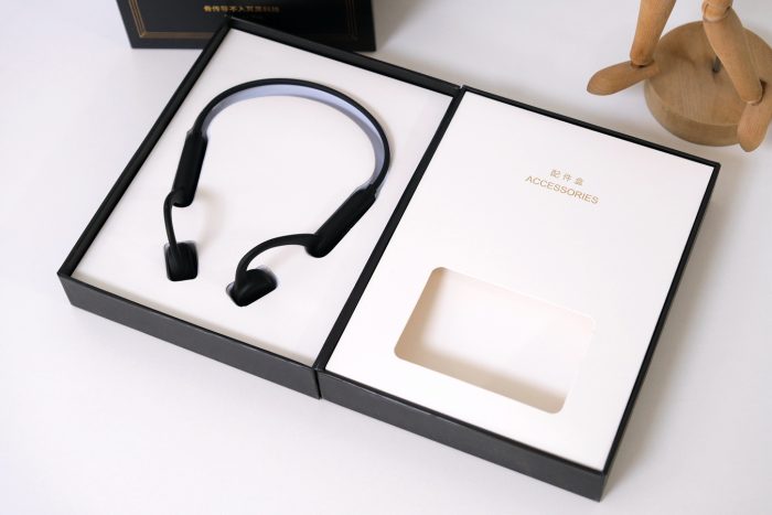 打开包装盒,耳机使用模具加以固定保护,配件则装入独立的小盒内,避免之间的磕碰。南卡Runner Pro的随机配件包括了内含保修卡的说明书、充电线和抗噪耳塞。因为骨传导蓝牙耳机的佩戴方式和传统耳机有所不同,所以厂家提供了抗噪耳塞,让用户根据自己的使用需求进行有效地隔音。