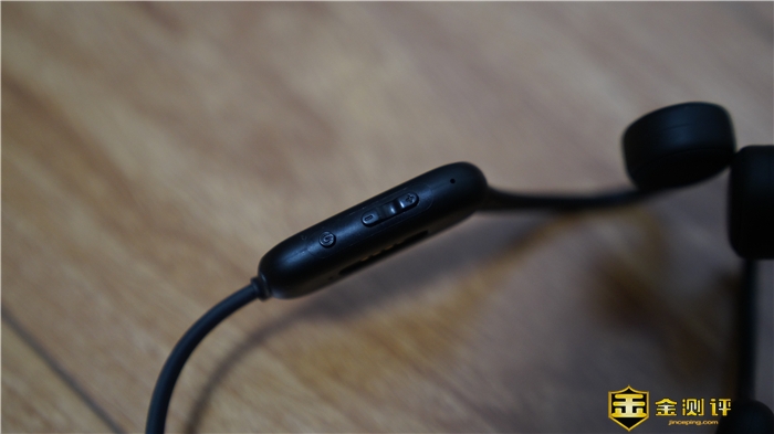 其底部则是耳机的按键区域,左侧为电源按键,右侧为“-”、“+”按键,按键区右边为耳机的麦克风。按键在形状上做了区别式的设计(电源键为圆形,“+”、“-”键为方形),便于用户盲按区分。单击开机键为播放/暂停音乐、接听/挂断电话,长按开机键1秒为唤醒语音助手;单击“-”为音量减,长按1秒“-”为上一曲;单击“+”为音量加,长按1秒“+”为下一曲。