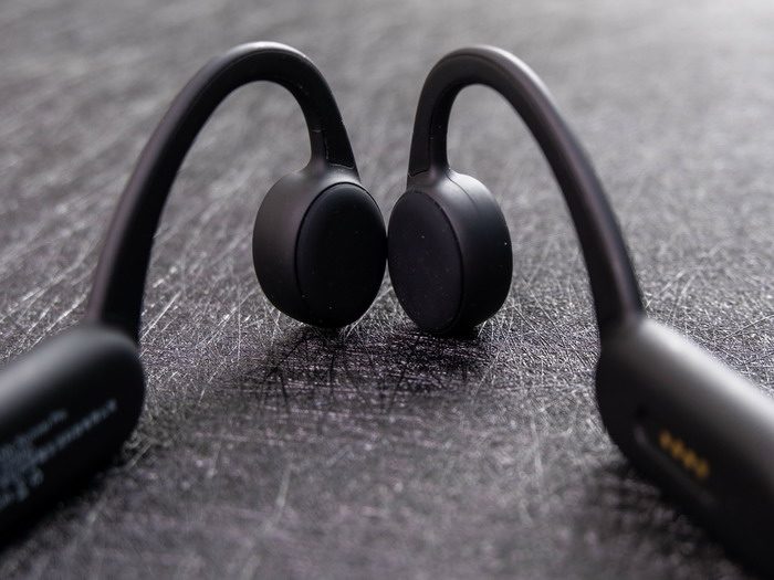 骨传导耳机的一个外观特点,就是没有声波传导耳机的扬声器出音孔。而且耳机最终也不是放到耳腔外,而是在耳朵旁边,这是骨传导耳机与声波传导耳机在佩戴方面的不同之处。