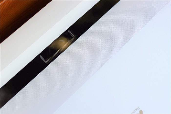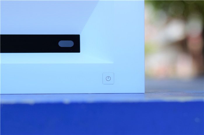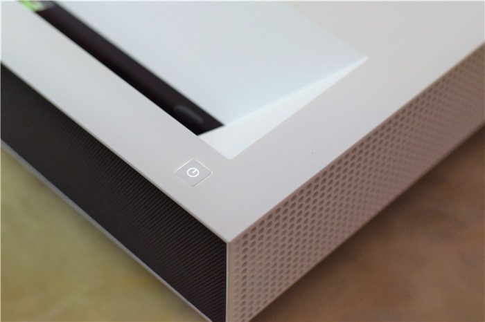 峰米C2整个外观采用乳白色作为主色调,颇显典雅低调,而且白色也比较容易和各种家居环境搭配。整个机身上表面中央位置设计有光峰的品牌LOGO图标进行点缀,偏下黑色的区域为镜头区,右下方设计有电源按键。整个激光电视主机的尺寸为45.6*30.8*9.1cm,整个尺寸控制还是不错的。