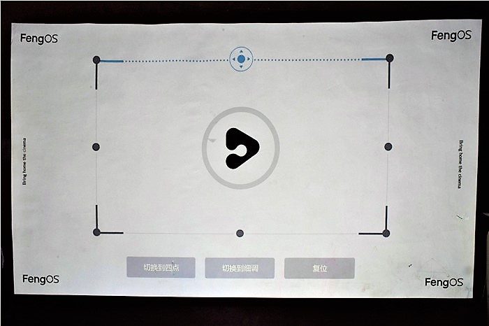 对焦之后,会进入到梯形校正界面,峰米C2拥有最多8点梯形校正功能,我们可以分别对8个点的位置进行校正,可以更好地解决墙面不平整、机位不正等带来的画面问题。