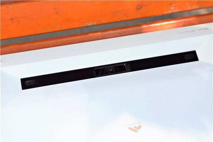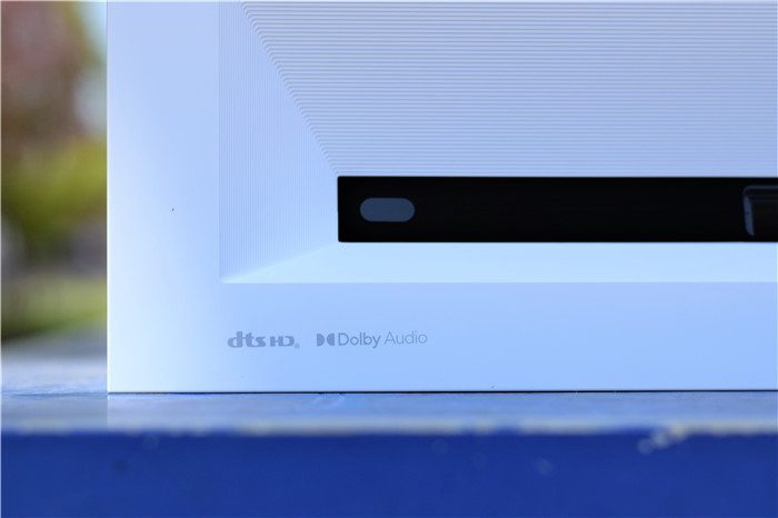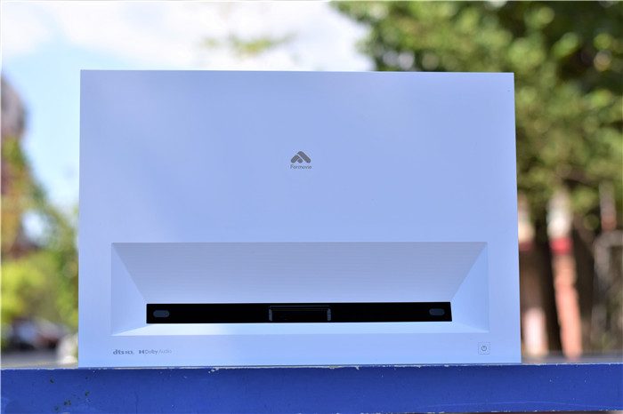 机身后部特写。机身后背基本被喇叭网覆盖,峰米C2配备了Dolby 音效&DTS 音效技术,拥有更好的音响效果。