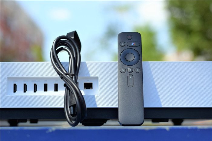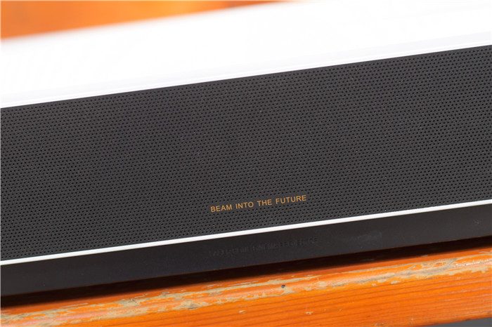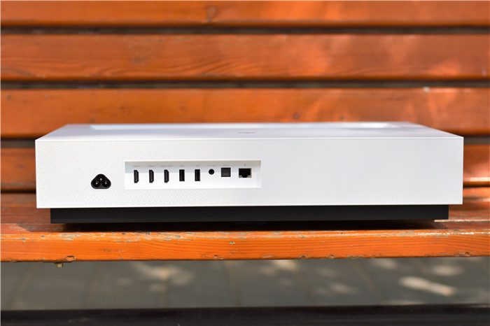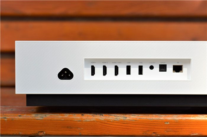 机身前部特写。峰米C2将大多数接口设计在了这个区域,从左到右依次为电源接口、3个HDMI2.0接口(最右侧的HDMI接口还可以作为ARC声音回传端口)、3个USB2.0接口(1个在侧面)、音频输出端口、光纤数字音频信号输出端口、有线网络连接接口,接口种类丰富,我们可以根据自己的需要选择使用。