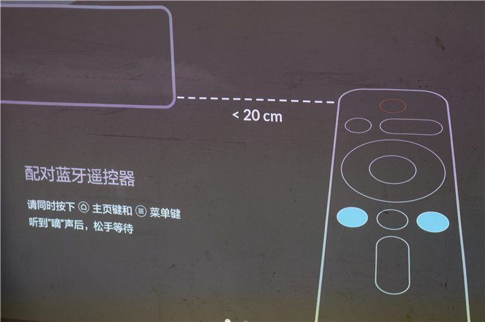 接通电源,点击电源键开机。将遥控器靠近激光电视的右下角,然后同时HOME键+菜单键进行遥控器配对即可。