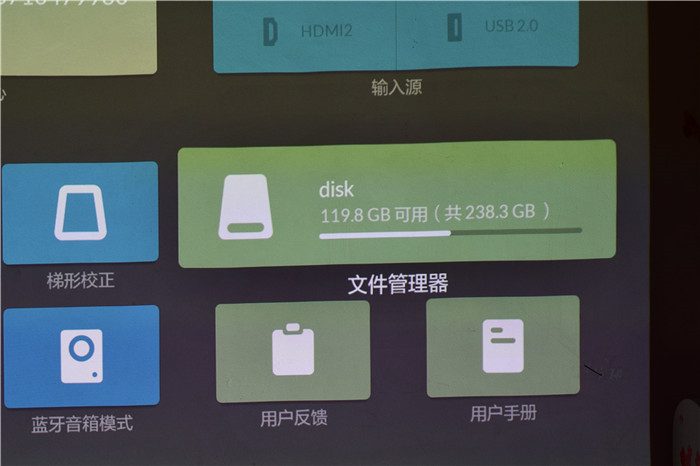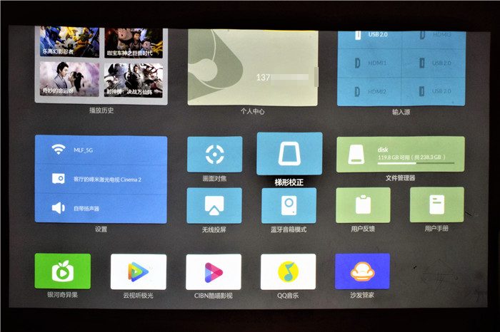 启动台界面包含播放历史、个人中心、输入源、设置、对焦、梯形校正、无线投屏、蓝牙音箱模式、文件管理、用户反馈、用户手册等模块,我们可以根据自己的需要进入到相应的细分界面进行设置。同时,启动台界面还包含银河奇异果、云视听极光、CIBN酷喵影视、QQ音乐、沙发管家等应用,方便我们使用。