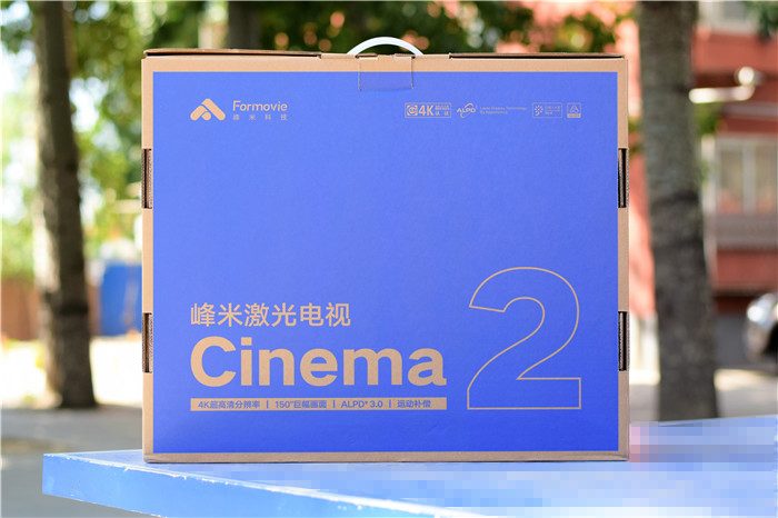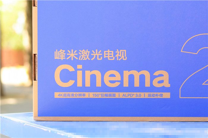 峰米激光电视Cinema系列C2(以下简称“峰米C2”)采用环保的蓝色纸箱包装,整个包装非常坚固能够起到很好的保护作用。纸箱的四周印有峰米的品牌LOGO图标、产品名称、产品的主打特点等。我们可以看到,这款激光的主要特点包括:4K超高清分辨率、最大150寸巨幕、ALPD 3.0、运动补偿等等。