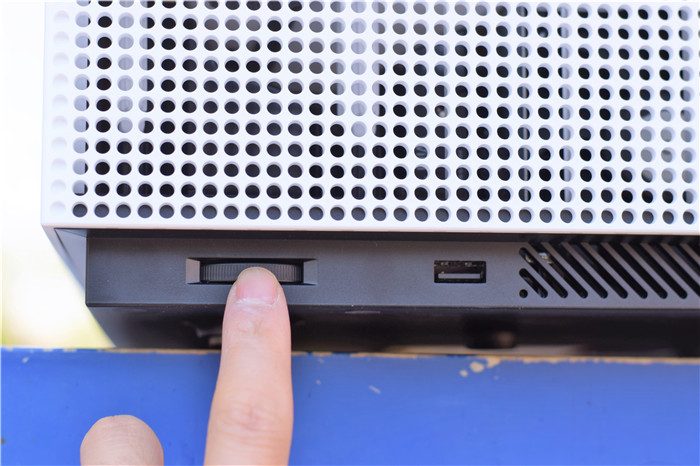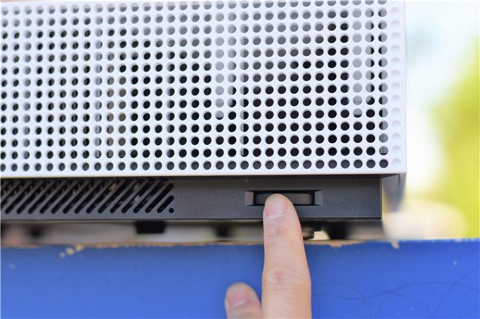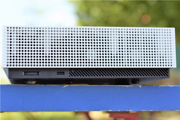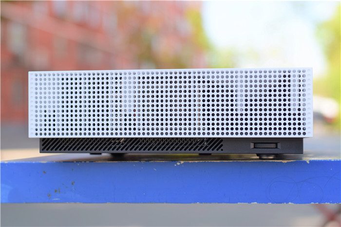 机身左右两侧被大面的散热孔覆盖,保证长时间使用可以有效地将热量散发出去。左右两侧均设计有高度调节轮,选择调节轮就可以微调投影底部的高度。除了高度调节轮之外,右侧还设计有一个USB2.0接口,方便我们外接储存使用。
