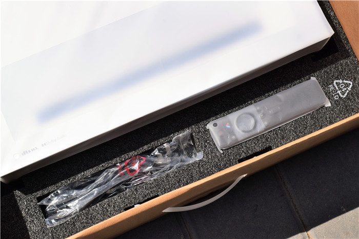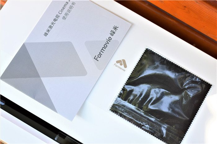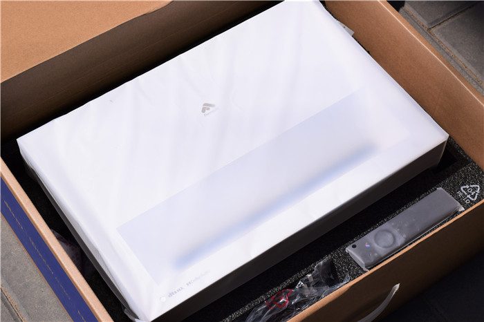 打开纸箱包装,上面有一层厚厚的定制泡沫,泡沫的中央放有纸质说明书等。将上层的泡沫拿掉我们就可以直接看到峰米C2了。整个激光电视被放置在一个塑料袋中,可以起到很好的防尘防水作用。除了激光电视主机之外,随机还附赠了电源线、遥控器、遥控器电池等。