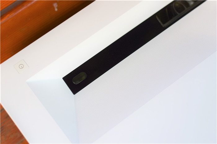 镜头区细节特写。中央位置为激光光源,两侧则分别设计有一个人体感应传感器,当有人靠近时,峰米C2可以快速将光源亮度调整到最低,更好的保护人眼。