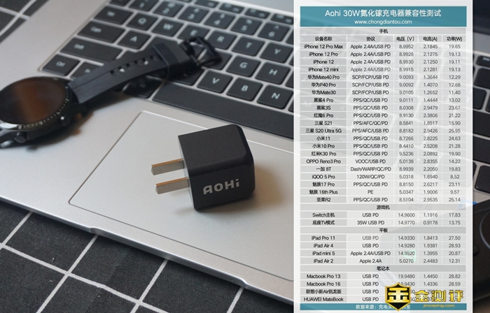因为小编没有电流电压标测试,所以就在网上找了这一张AoHi30W充电头的兼容测试表,上面有很多热门的机型测试数据仅供大家参考,数据来源是充电头网评测屋。