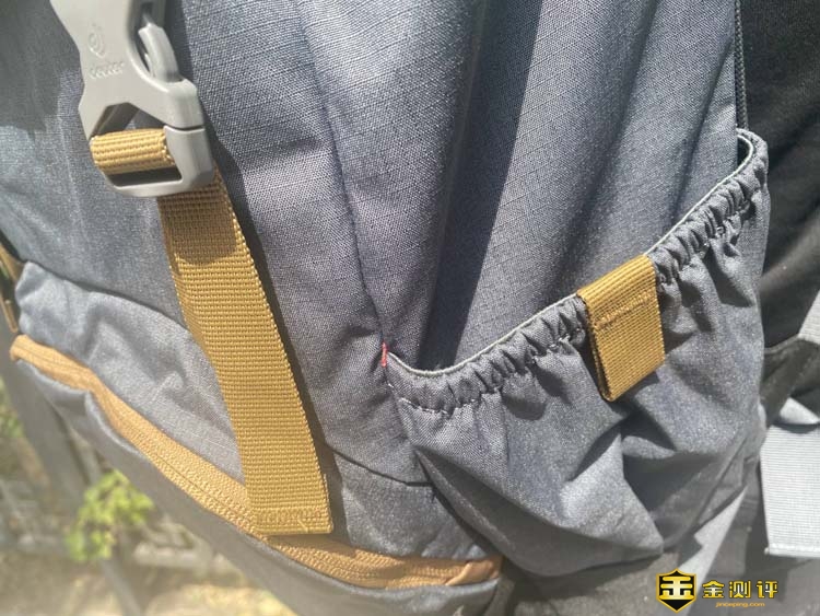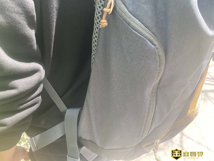除了主仓之外,背包的正面还有一个15cm长宽的带拉链的储物包,可以放小吃、钥匙、存储卡等频繁使用的东西,存取非常方便。内有钥匙扣以及笔袋和手机夹层,频繁拿取非常方便。 另外包的左右侧面各一个口袋,其中左边口袋是收口处有弹性绳的敞开式设计,可以放喝水杯、雨伞之类的东西,在剧烈运动的时候也让水杯不会掉出来,实用性不错,右边口袋可以放置鼠标、移动电源等东西。