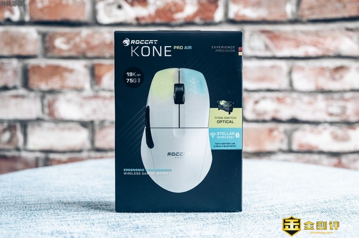 KONE Pro Air现在有黑白两种配色,包装方面比较简约,上面重点强调了这款鼠标75克重量,以及高达19000 DPI,还有续航长达100小时的Stellar无线连接等特性。至于操作方面,这款鼠标还有Titan铝制滚轮、光轴按键以及纯PTFE热处理鼠标垫脚等方面的设计特色。