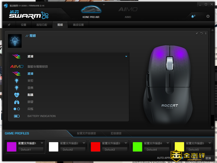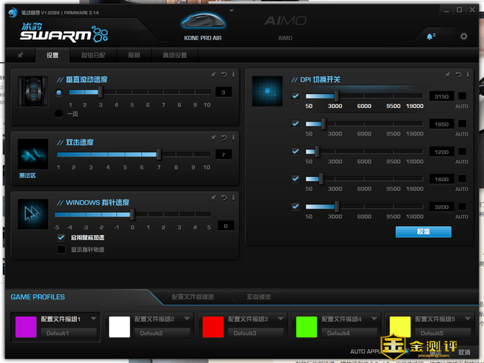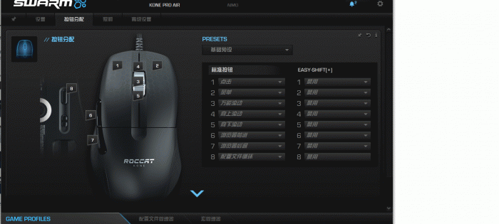 可能是为了减轻鼠标重量的缘故,KONE Pro Air上面的按键不是很多,像是专门的DPI调节键就没有,功能键也只有一对基础的浏览器前进后退按键,所以更多的功能和设置都需要通过驱动软件冰豹Swarm来进行。