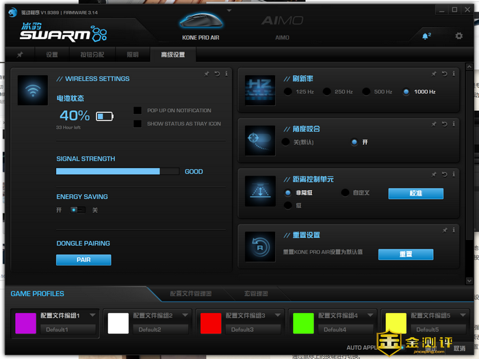 最后就是一些高级设置,比如鼠标的电量状态,预估剩余时间,以及信号的强度,外加刷新率、角度咬合、距离控制单元等比较专业化的功能。值得一提的是,我们可以通过冰豹Swarm预设5个配置文件,并且默认存储在鼠标上面,这样即使换了一台设备,并且没有安装冰豹Swarm,设置好的配置文件依然可以发挥作用,并且可以通过鼠标上的按键进行切换。