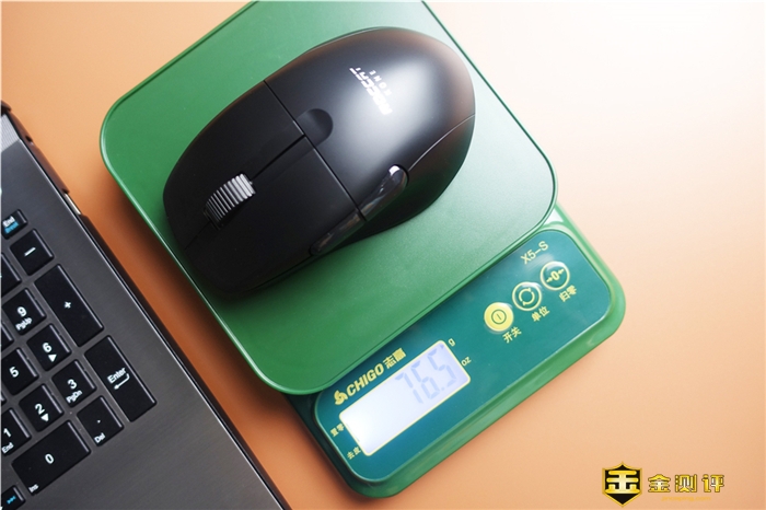 在重量方面也是非常轻巧的,我实际的称重了一下,加一个2.4G无线接收器一起称重,可以看到当前的重量为76.5g,那么可以看出,这个重量和官方给出的重量75g也是差不多的,那么为什么冰豹Kone Pro Air游戏鼠标那么轻巧呢,这主要是鼠标采用了轻便且坚硬的蜂巢內壳,能够阻挡灰尘和污物,且实现了极致轻量化。