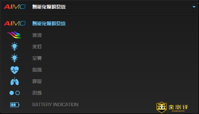 现在的电竞产品如果没有耀眼的灯效,那么我只能说这款电竞产品是没有灵魂的,试想一下在激烈的游戏过程中如果少了“激情四射”的灯效,那么和咸鱼有什么区别,通过驱动里面的照明设置,你可以选择,多种灯效模式,目前有波浪、关灯、全亮、心跳、呼吸、闪烁,BATTERY INDICATION等多种灯效模式调节。