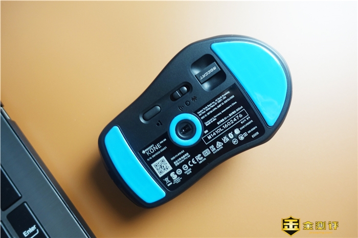 底部的设计非常的平整,并用有上下两枚防滑垫组成,中间则是寻迹激光传感器,其精准度非常的高,也非常的灵敏,能够让你快速准确的跟踪和瞄准,此次的冰豹Kone Pro Air游戏鼠标因为搭配有2.4G无线接收器,所以收纳接收器的位置也放置在下方,边上还有一个模式开关,可以切换2.4G无线和蓝牙模式。