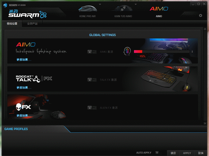 进入软件界面可以看到,界面比较的有科技感,如果你是一个普通的玩家可能对于鼠标的相关设置并不会关心,但是对于一个电竞玩家来说,鼠标的相关设置就比较的重要了,比如设置,按键分配,RGB灯效等,这些的应用设置都需要下载驱动软件,当然冰豹Kone Pro Air游戏鼠标也有自己的驱动平台(SWARM驱动管理平台),需要去官网进行下载,然后安装,即可使用。