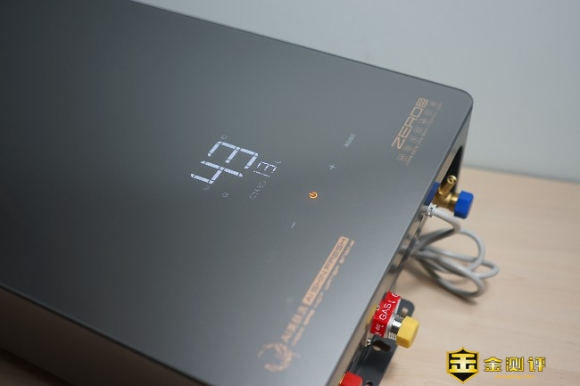 燃气热水器的正中央下方布置了一块隐藏式的显示屏,用户可以通过触控式的显示屏实现各种操作,无论是模式切换还是温度设定都可以通过显示屏完成,工作的时候显示屏可以实时显示设出水温度以及模式。燃气热水器触控式显示屏的底部还印有产品的主打卖点,如零冷水、分段燃烧等字样。