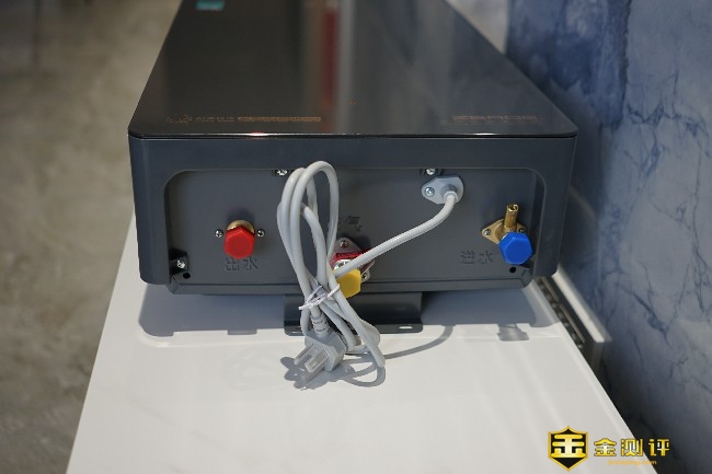 燃气热水器机的底部分布了各种接口,分别是:热出水口、电源线、燃气进口、冷进水口,接口处有文字标识方便安装连接。