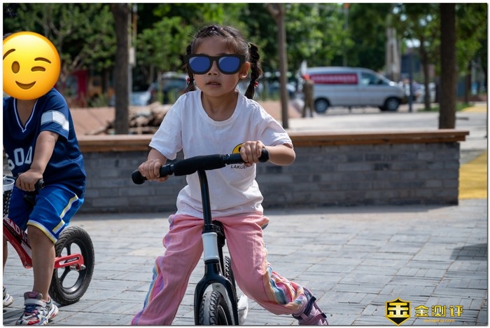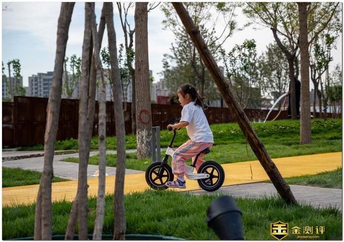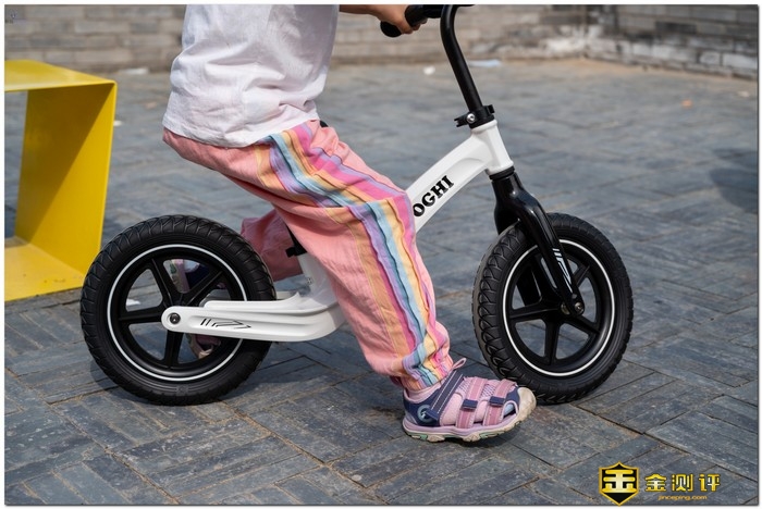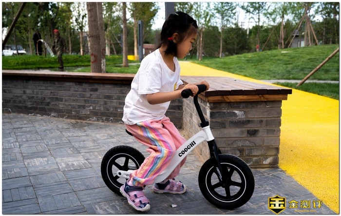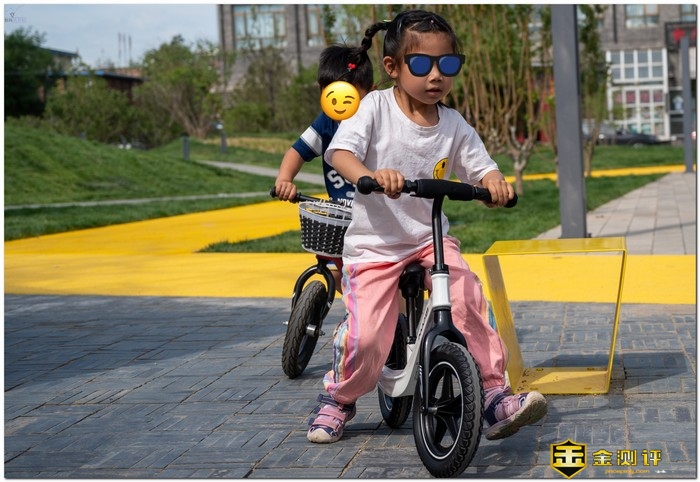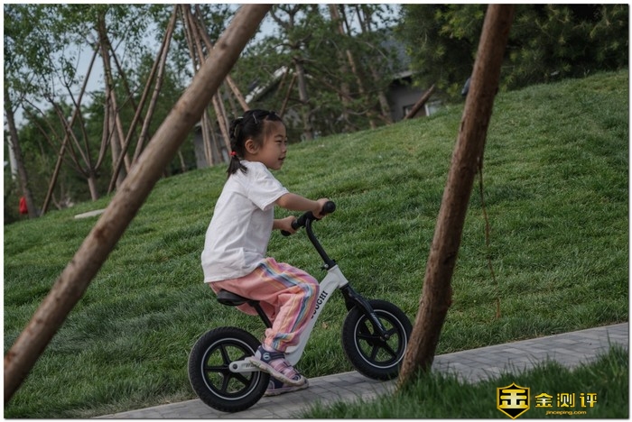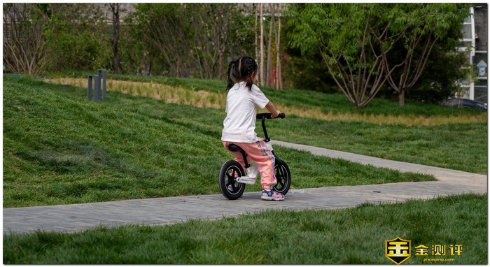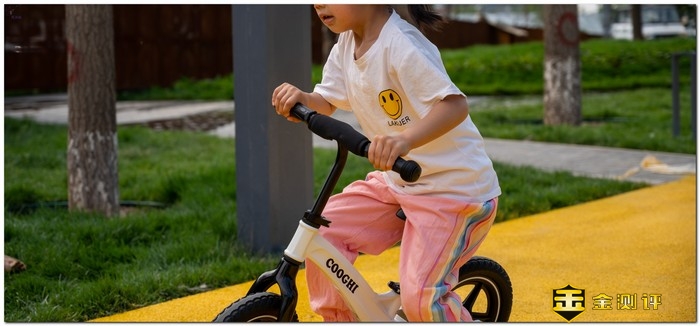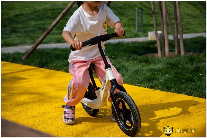 因为没有装车轮之类的复杂操作,所以组装确实很简单,就这样把平衡车组装好之后,只要再稍稍调整一下车把和车座的高度,小朋友就可以上车玩耍了。这款平衡车的车座、车把调节起来都很简单,并且带有扣具锁定,提高了安全性。目前这款平衡车适合身高80到120厘米的小朋友使用,像是2岁左右的小孩,在这款平衡车的最低高度下也能双脚着地玩耍。