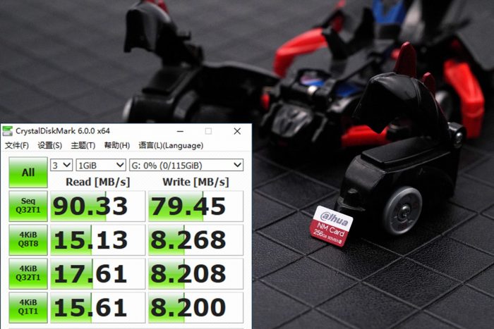 通过主流的CrystalDiskMark软件对其进行测速,可以看到读取速度最高峰值为90.33MB/s,写入速度为79.45MB/s,表现符合标称速度。
