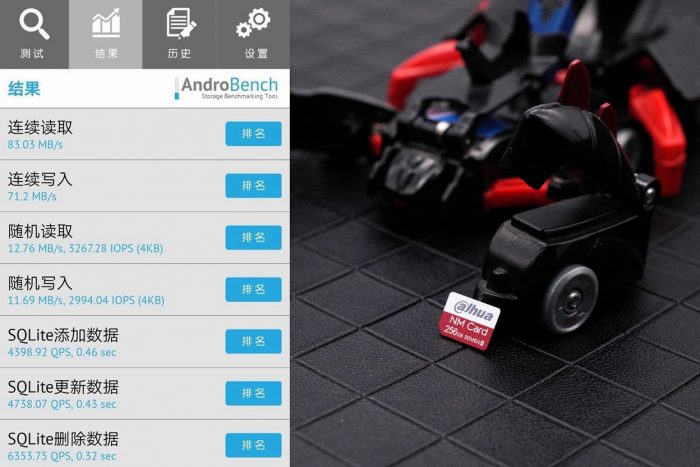 通过AndroBench测试大华NM卡插入手机后的读写速度,可以看到连续读取83.03MB/s、连续写入71.2MB/s,配合优秀的IOPS性能,在应对手机拍摄vlog甚至4K视频时,也是十分轻松的。