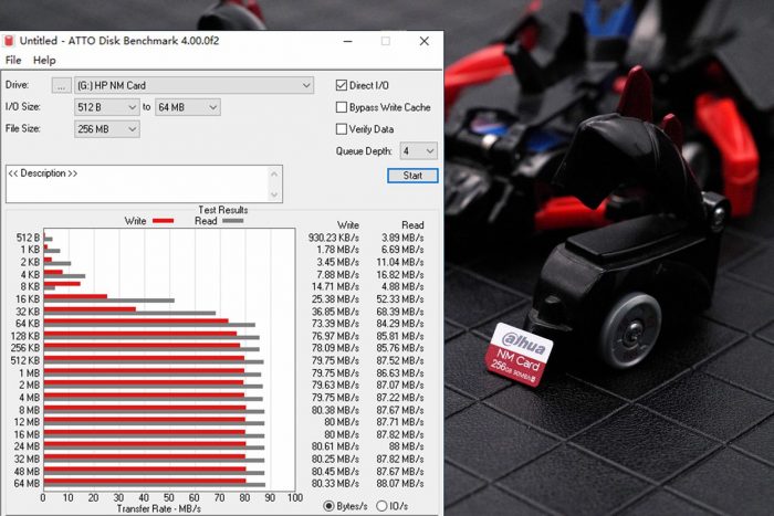 通过ATTO Disk Benchmark的测试结果可以明显的看出,大华NM卡在64KB以下时的读取速度一般,在64KB数据块之后,读取速度基本达到稳定值,写入速度为80MB/s左右,读取速度为88MB/s左右,整体读写表现不错。