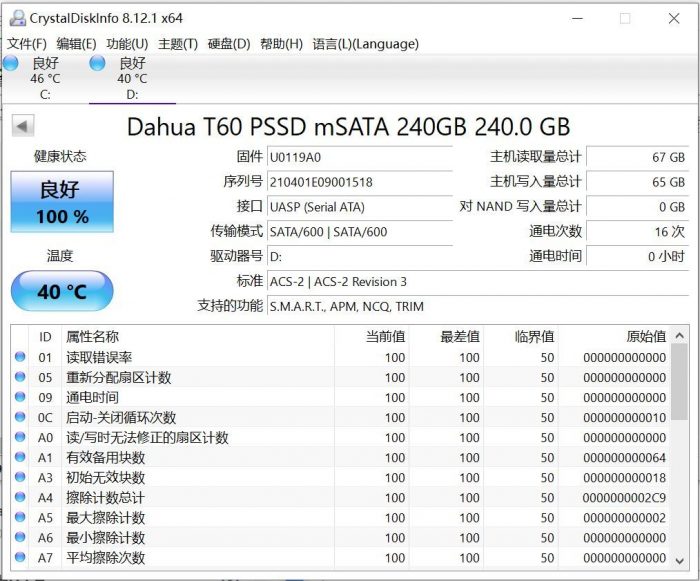 Windows下对大华移动固态硬盘T60识别结果:Dahua T60 PSSD mSATA 240GB,传输模式SATA/600,支持SMART、APM、NCQ、TRIM功能。
