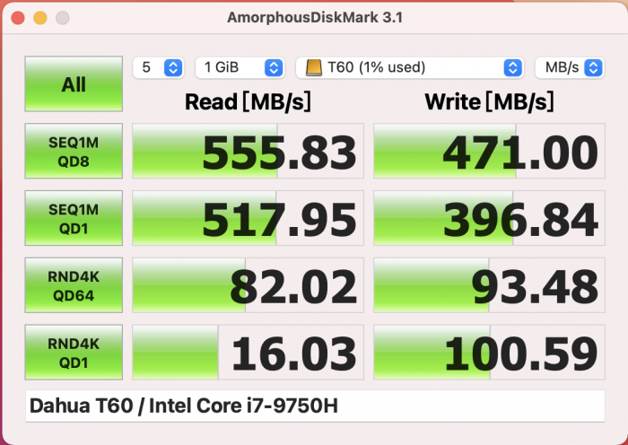测试设备是MacBook Pro,连接设备后使用AmorphousDiskMark进行读写测试,有的网友能看到这款软件和CrystalDiskMark非常相像,测试的方法也是大致相同,看看结果吧。连续读取速度达到555MB/s,写入速度为471MB/s,两个系统下读写速率都与说明一致。