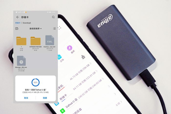 笔者试水的型号为DH-PSSD-T60-240G,优势在于使用了USB 3.2 Gen2,配有USB-A及USB-C转接线,可以支持Windows、macOS与我的华为手机。