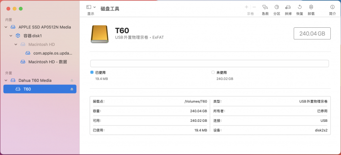 大华移动固态硬盘T60到手后肯定要测试一下读写速度,由于笔者的移动电脑有Windows和macOS两种系统,所以这款T60初始化为了兼容两种系统的ExFAT分区。如果只有单系统,那么Windows的NTFS、macOS的APFS也会让数据传输更加快速。