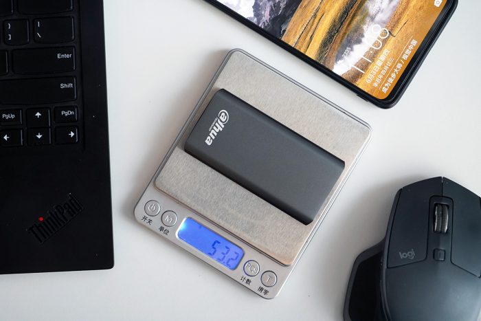 入手实测重量为53克,考虑到抗震防冲击的金属外壳,对于移动存储类设备来说可算比较轻便的,女孩子放入手提包中也不会有什么重量变化。