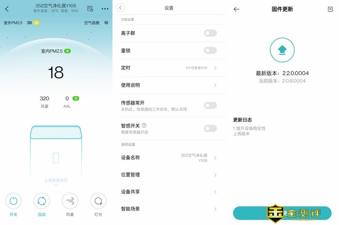 作为一款接入米家生态的净化器,352 Y106很容易就可以完成和米家APP的绑定操作,期间只需要将净化器接入家里的WiFi,我们之后就可以实现对净化器进行各种远程操作,并且净化器本身也可以通过固件升级等方式获得优化,改善日常的使用体验。