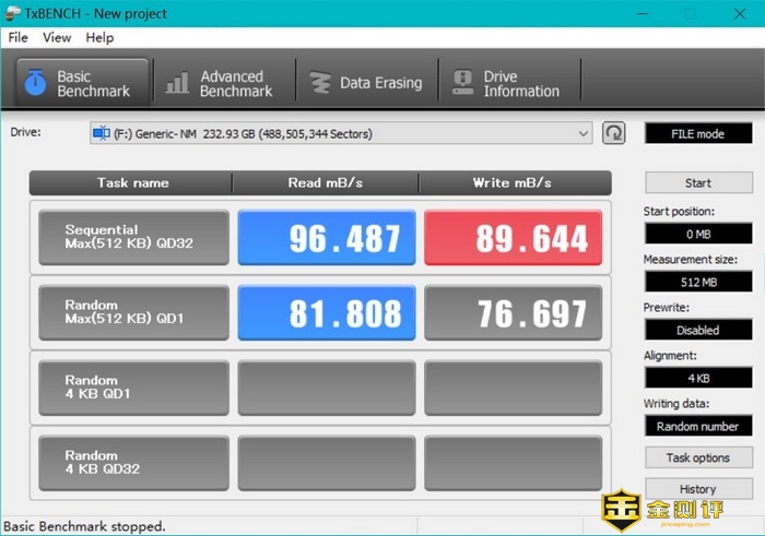 接着我们再用TxBENCH来进行测试,看看结果怎么样。从测试的结果可以看到,大华N100的顺序读写速度和刚才的测试结果出入不大,其中读取速度为96.487MB/s,写入速度则是89.644MB/s。