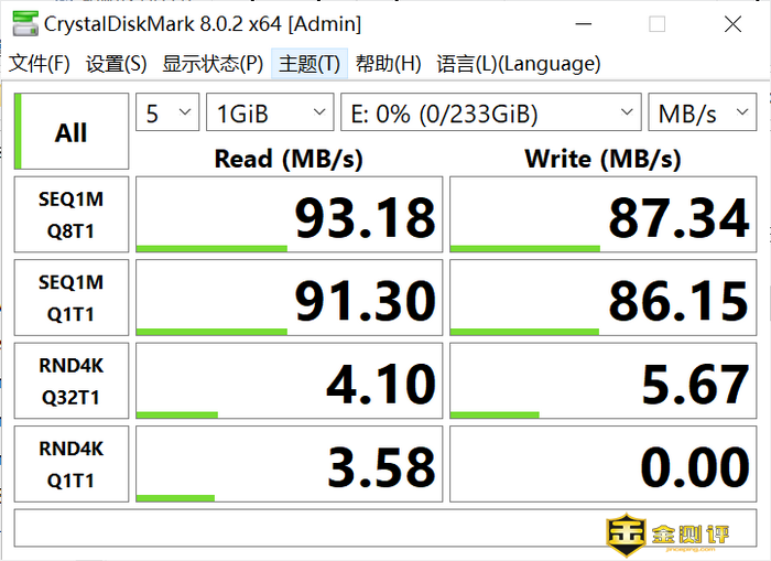 我们先用CrystalDiskMark 8.0.2来测试这款NM卡的读写速度表现,从测试的结果可以发现,这款卡的读写速度确实符合大华提供的数据,具体来说,这款卡的顺序读取速度为93.18MB/s,写入速度为87.34MB/s,在手机上拿来连拍照片甚至4K视频都没什么问题。
