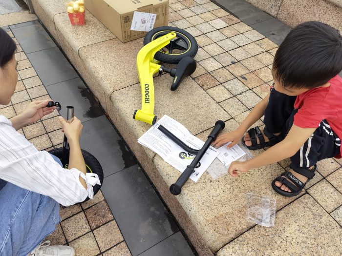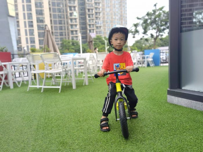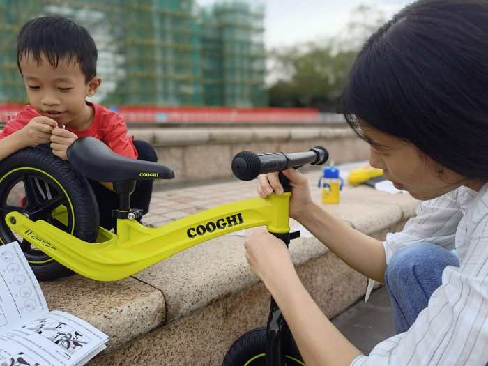 最后根据儿子的身高调整车把与坐垫,寻找最舒服的高度,更利于前进滑动。