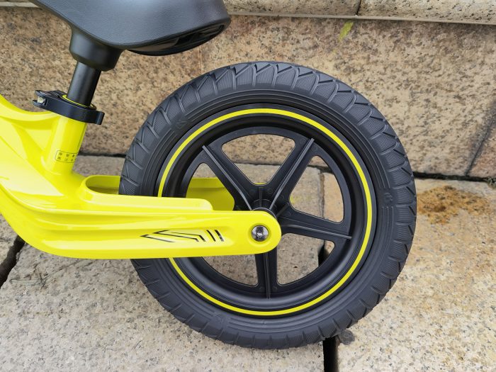 整体车的设计与质感,如其名,真的很酷,黄色车身,连接轮毂的黄色外环,整体颜值非常高,搭配炫酷的流线型车身,三幅式轮毂、缓震橡塑实心轮胎,真的是酷劲十足,充分地诠释了简约美学,别说是儿童,就是我看了都非常喜欢。