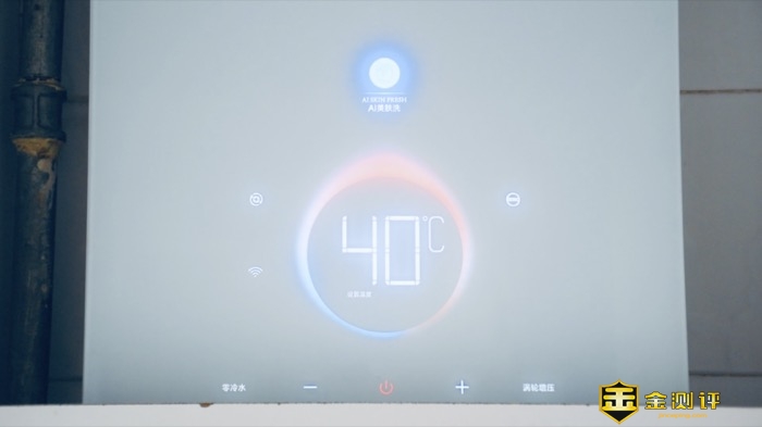 热水器面板功能跟多,中央设计了彩虹呼吸灯展示当前工作温度,两侧展示了当前的功能开启状态,底部是温度的调节区域,和功能的开启位置,面板的触控灵敏,效果不错。