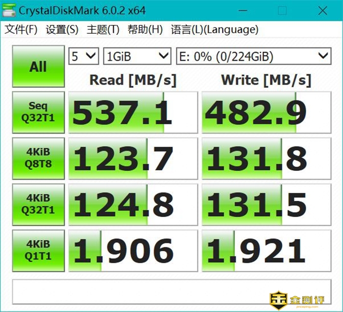 在PC上面我们简单对这款大华T60进行一下速度测试,首先用CrystalDiskMark 6.0.2进行测试,从测试结果可以看到,在1GB文件的读写测试中,这块移动固态硬盘的顺序读取速度为537.1MB/s,顺序写入速度则是482.9MB/s,基本符合官方的550MB/s读取标准。