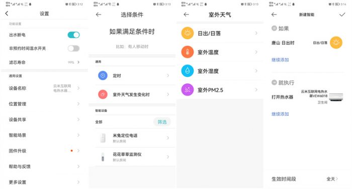 当然作为互联网家电的云米NANO X1 AI电热水器,AI功能还不限于此,你可以将热水器作为智能家电的一份子,加入你的智能场景模式,比如你可以设置成日出或日落时自动开启或关闭热水器,甚至可以与其他智能家电进行智能联动自动运行,例如通过小爱音箱进行语音操控开关等等,这才是AI智能家电的终极模式。
