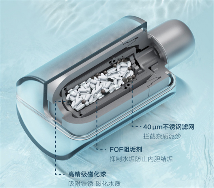 可别小瞧这个“小滤瓶”,它可是暗藏玄机哦!一共有三级滤芯,第一级是40um的不锈钢滤网,可以拦截泥沙等颗粒性杂质;第二级加入了FOF长效阻垢剂,可以有效抑制水垢,防止内胆结垢;第三级高精级磁化球,能够吸附水中铁锈,并磁化水质,进一步防止结垢。通过小滤瓶的三重过滤,阻垢率高达91.7%,为热水器提供了干净的水源。