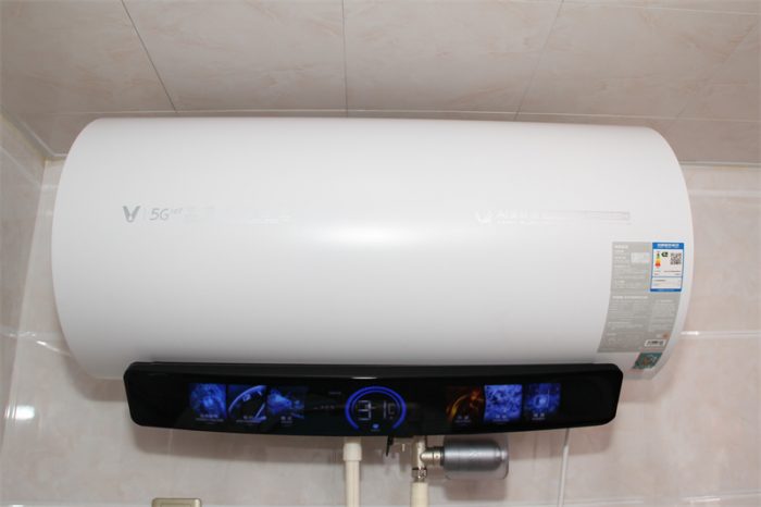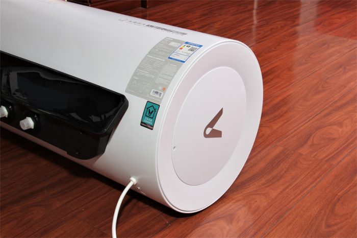 热水器采用了最为节省材料的圆柱筒形外观,在热水器白色筒身的正面水平中心线位置印有功能标识图案和文字,功能一目了然,一级能效的标识彰显了节能的最高水平了。两端的V字型云米logo十分醒目。该款热水器有50L和60L两种容量,适合三四口的小家庭使用。