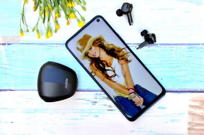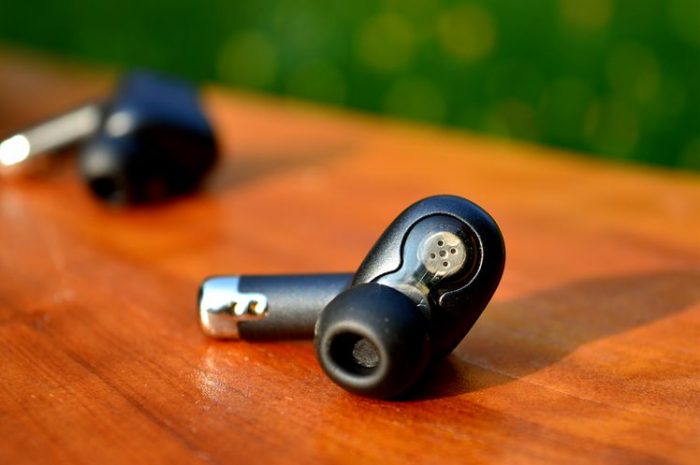 耳机的前腔呈现透明状,透过壳体可见到内部结构,有一点科幻感。耳机柄的下方是充电触点和麦克风,出音孔处有丝网防护,便于清理耳屎等赃物。