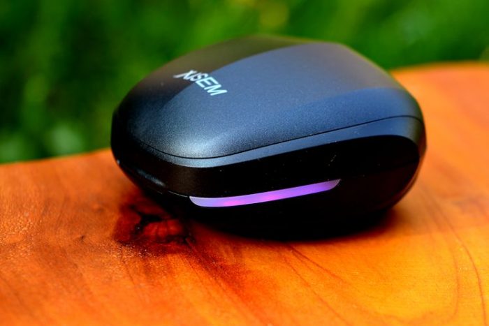 耳机收纳盒同时也兼做充电仓使用,在立体感十足的盒子两边,分别有一条RGB呼吸灯条,并可根据电量改变显示颜色,RGB呼吸灯的加入,让它的游戏属性更加凸显。