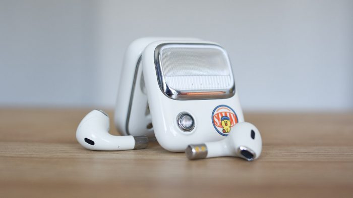 仓内为放置两只耳机预留有对应的凹槽,在耳机柄部分凸起的位置预留有充电触点。下方除了印有人物IP名称之外,两侧还设计有复古的金属构件作为点缀。